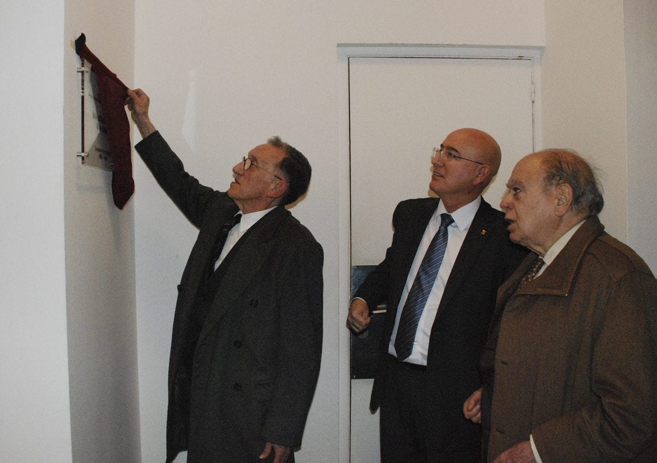 Max Cahner obrint la placa commemorativa amb el seu nom de la sala d’exposicions del Palau Moja davant el conseller Joan Manuel Tresserras i el l’ex-president Jordi Pujol, l’any 2010.